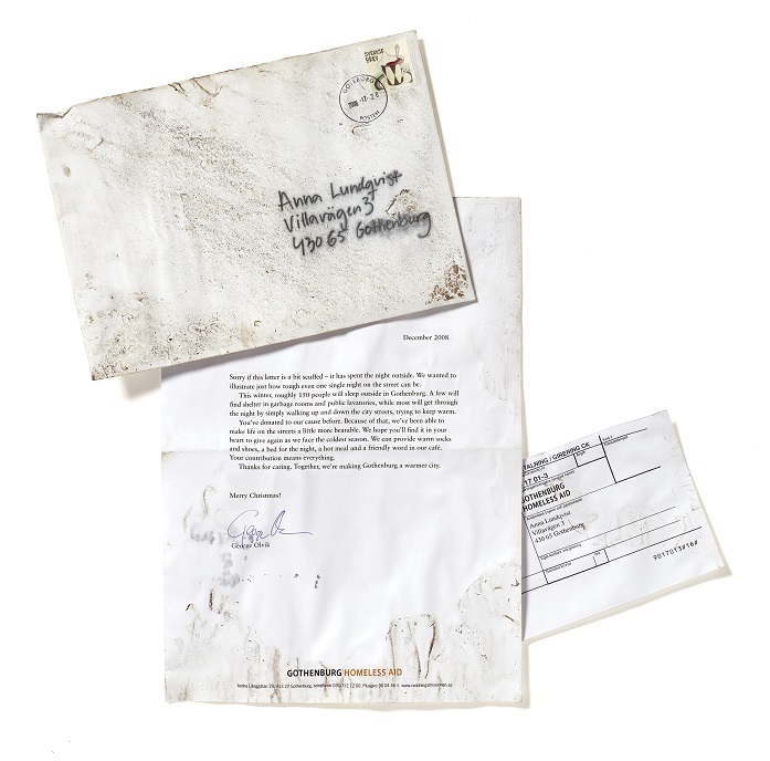 It's hard to get people's attention with charity campaigns and even harder at Christmas. To make the letter stand out in the avalanche of Christmas cards, the agency, before mailing it, let the letter spend a night on the Streets. The letter experienced the same wet and cold as the homeless of Gothenburg- and it looked it.